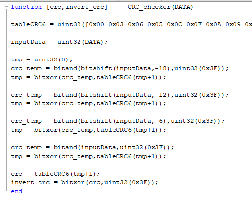 The tableCRC6 follow the BiSS sample code (also here: https://forum.arduino.cc/index.php?topic=517714.0), C example code was also given, the code is altered to MATLAB code