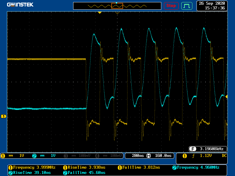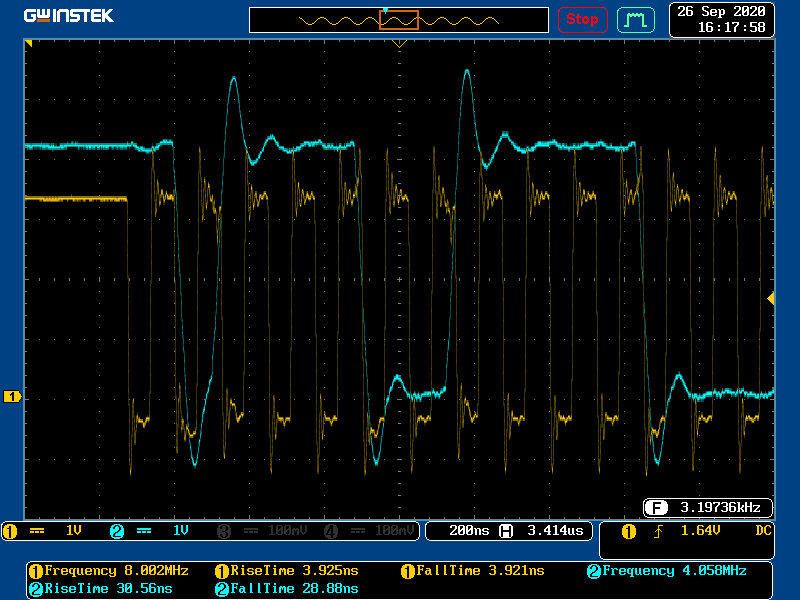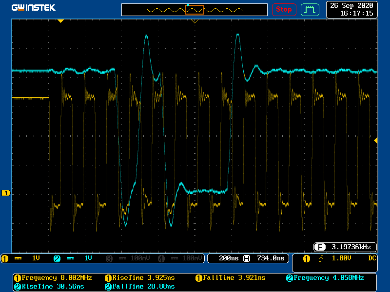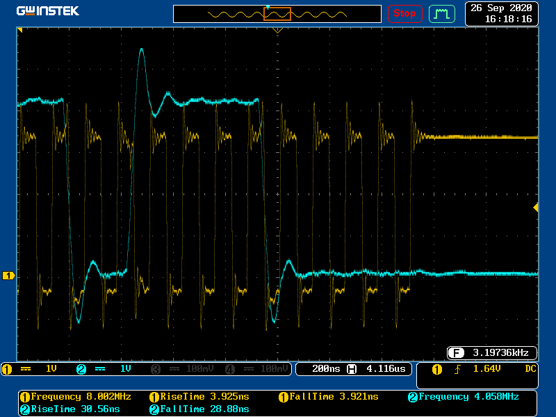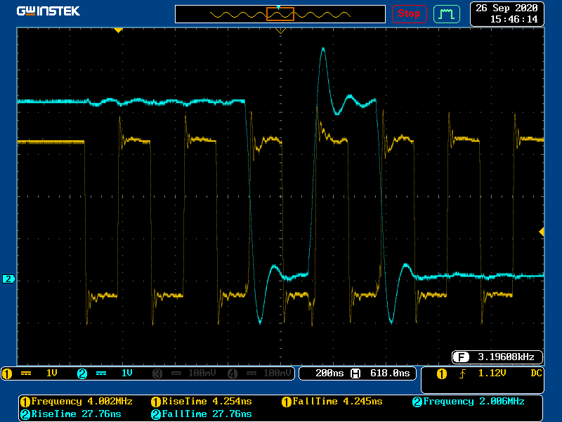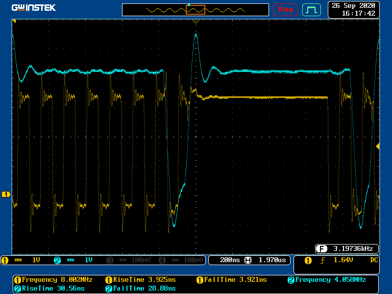 Scope Data @ 4MHz (ACK - START) (RS422(CLK) , Delfino(Data))